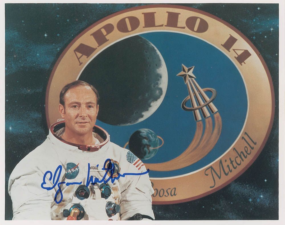 Color satin-finish 10 x 8 photo of Mitchell posing in his space suit in front of an Apollo 14 emblem, signed in blue felt tip. In fine condition, with a few scattered light bends.