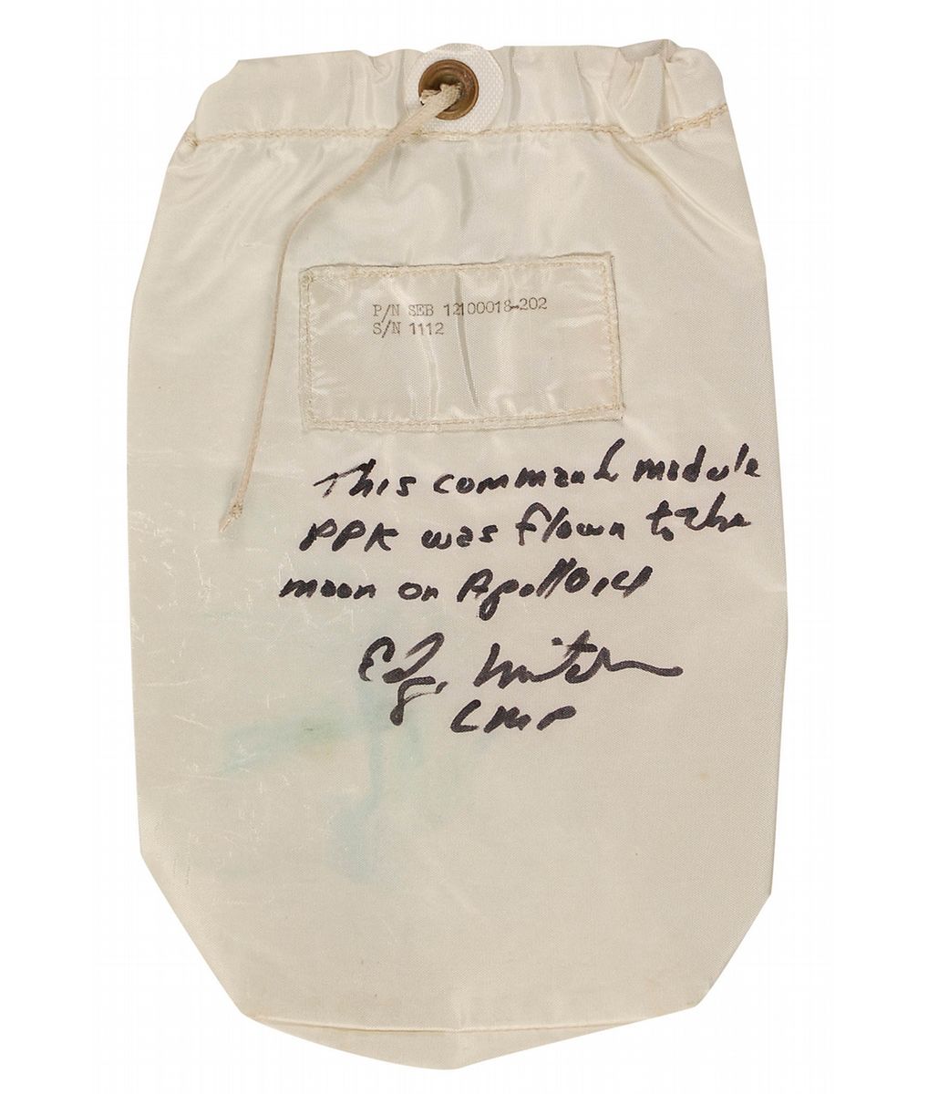 Edgar Mitchell’s flown PPK bag carried on the Apollo 14 command module. Bag measures approximately 6 x 9.25, with a patch sewn to one side with “S/N 112,” and another identification number printed on it. Signed in black felt tip, “This command module PPK was flown to the moon on Apollo 14. Edgar Mitchell CMP.” Some scattered light soiling and a broken drawstring, otherwise fine condition. Identified personal items of any astronaut are highly-prized by collectors.