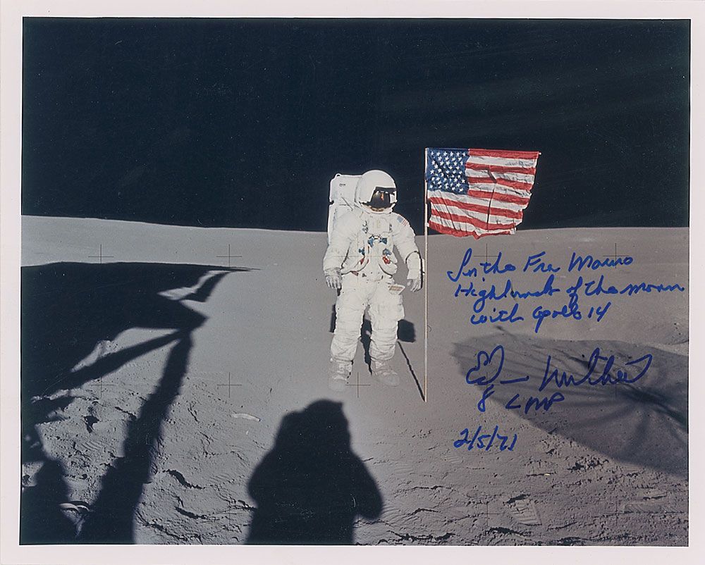 Color satin-finish 10 x 8 photo of Mitchell with the flag on the lunar surface, signed in blue felt tip, “In the Fra Mauro Highlands of the moon with Apollo 14, Edgar Mitchell, Apollo 14 LMP 2/5/71.” In very fine condition.
