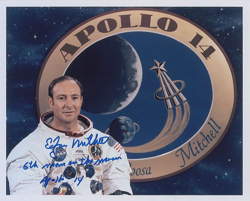 Color satin-finish 10 x 8 photo of Mitchell posing in his white space suit in front of the Apollo 14 mission insignia, signed in blue felt tip, “Edgar Mitchell, 6th man on the moon, Apollo 14.” In very fine condition.