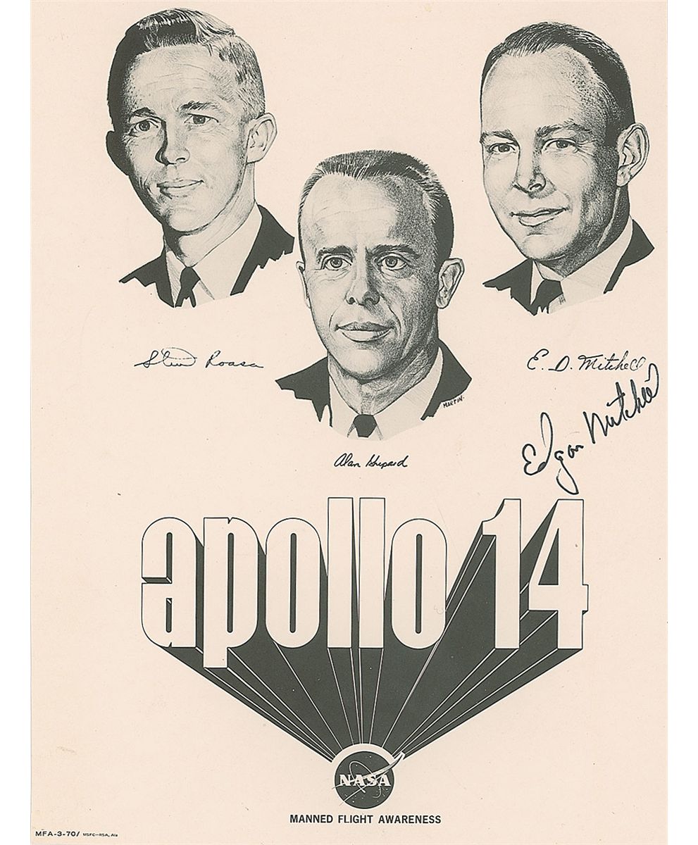Manned Flight Awareness Poster for the Apollo 14 mission, 8 x 10.5, bearing images and printed signatures of crew members Stu Roosa, Alan Shepard, and Edgar Mitchell, signed in black felt tip by Mitchell. In fine condition.