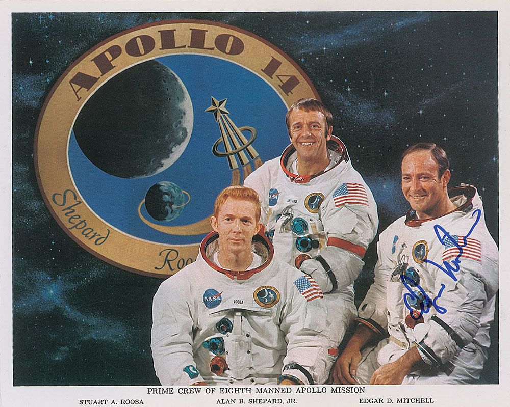 Color 10 x 8 NASA photo of the Apollo 14 crew posing in their white space suits in front of their mission emblem, signed by Mitchell in blue felt tip. In fine condition.