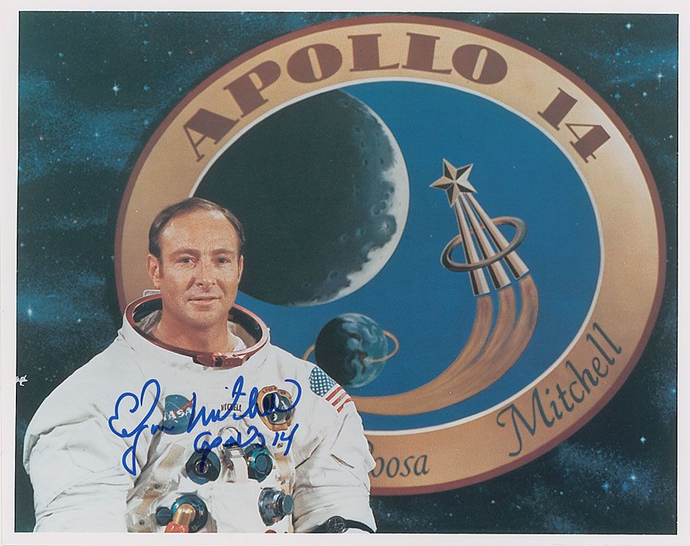 Color satin-finish 10 x 8 photo of Mitchell posing in his white space suit in front of the Apollo 14 mission insignia, signed in blue felt tip, “Edgar Mitchell Apollo 14.” In fine condition.
