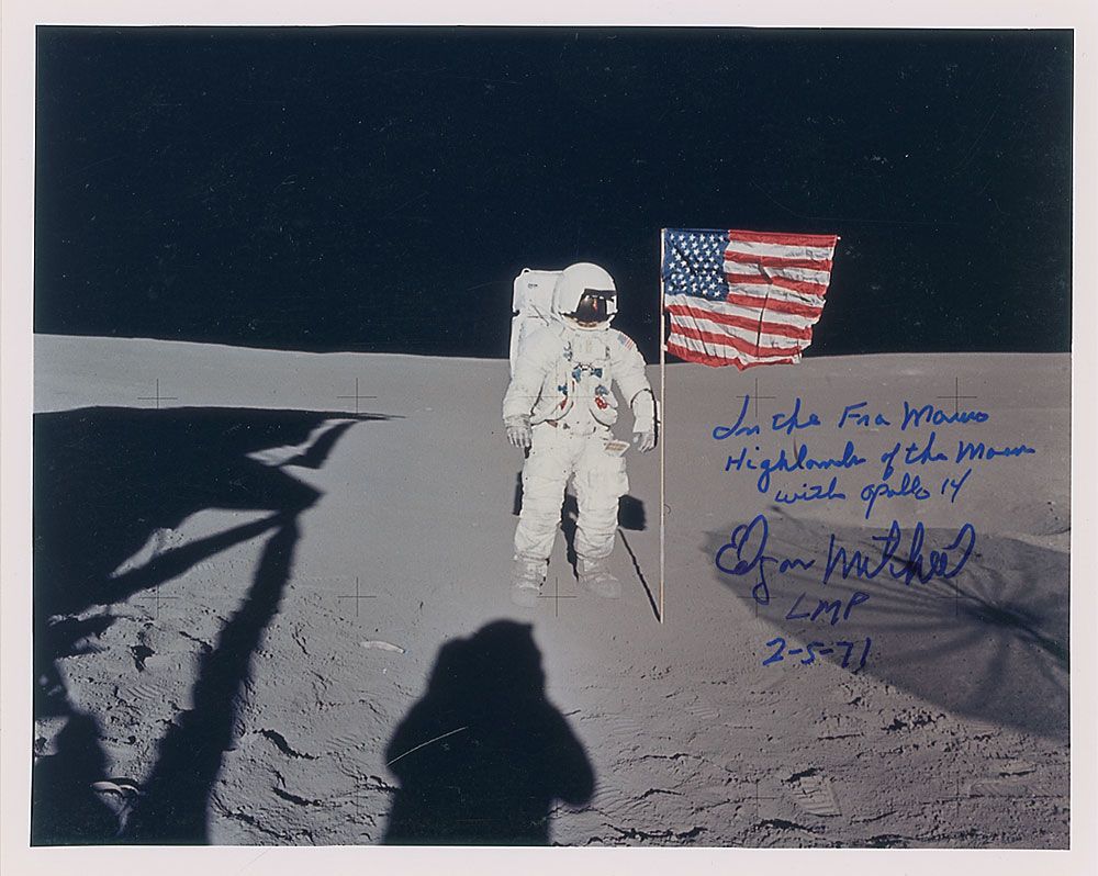 Color satin-finish 10 x 8 photo of Mitchell standing next to the American flag on the lunar surface, signed in blue felt tip, “In the Fra Mauro Highlands of the Moon with Apollo 14, Edgar Mitchell, LMP, 2-5-71.” In very fine condition.
