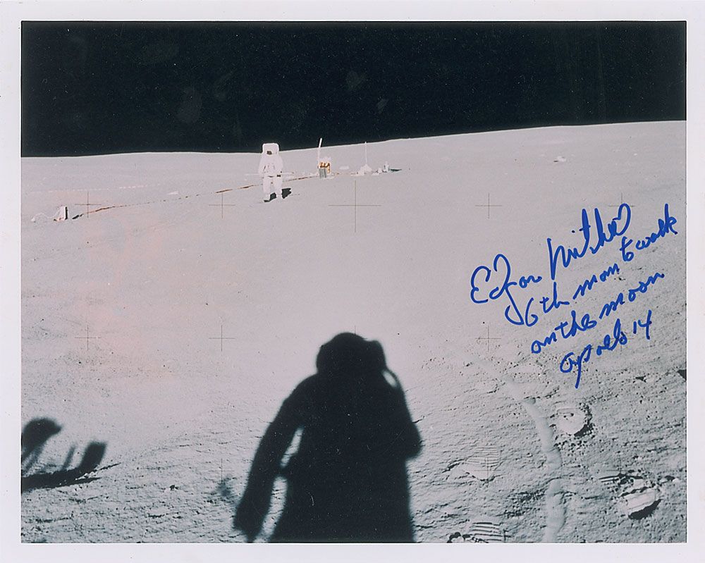 Color satin-finish 10 x 8 photo of Mitchell on the lunar surface, signed in blue felt tip, “Edgar Mitchell, 6th man to walk on the moon, Apollo 14.” In fine condition.