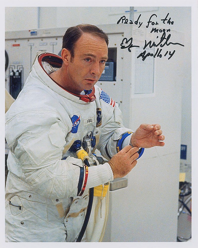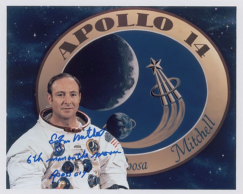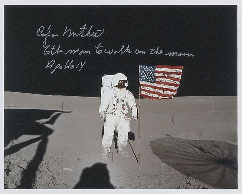 Three color satin-finish photos: a 10 x 8 of Mitchell on the lunar surface, signed in silver ink, “Edgar Mitchell, 6th man to walk on the moon, Apollo 14”; a 10 x 8 of Mitchell posing in front of his mission emblem, signed in blue felt tip; and an 8 x 10 of Mitchell preparing for his launch, signed in black felt tip, “Ready for the moon, Edgar Mitchell, Apollo 14.” In very fine condition.