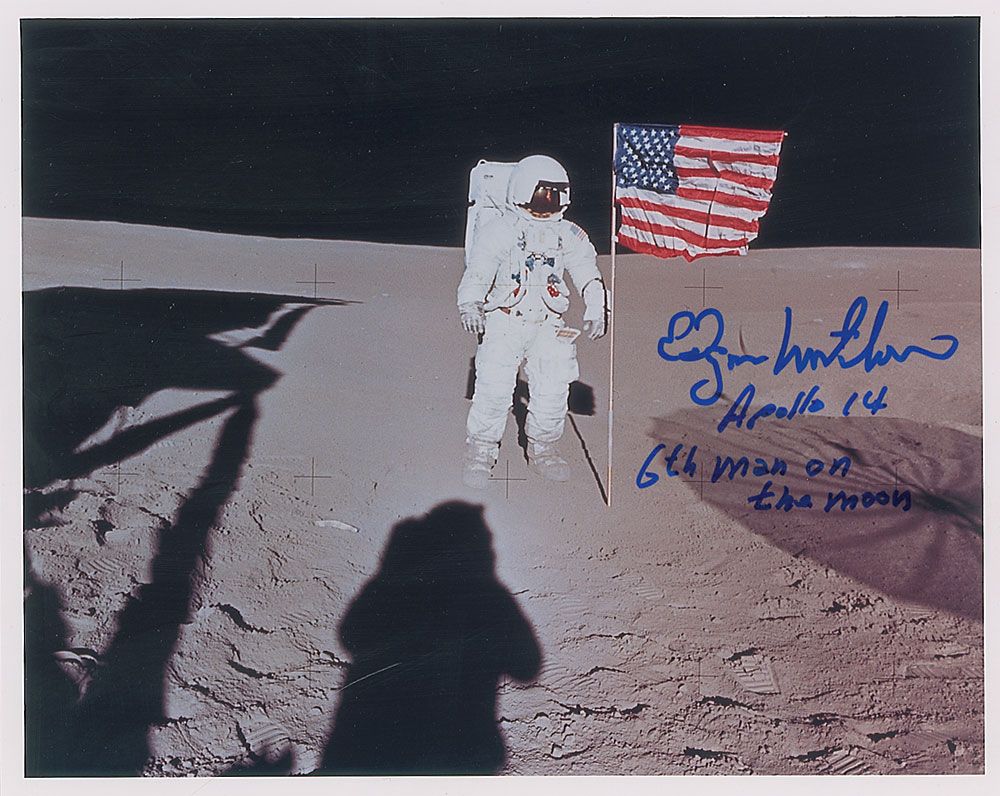Color satin-finish 10 x 8 photo of Mitchell standing next to the American flag on the lunar surface, signed in blue felt tip, “Edgar Mitchell, Apollo 14, 6th man on the moon.” In very fine condition.