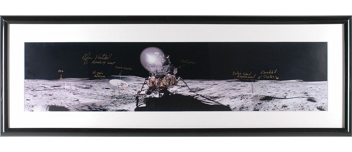 Impressive color satin-finish 31.5 x 7.25 panoramic photo of Mitchell and the Lunar Module on the surface of the moon, signed in gold ink, “Edgar Mitchell, Apollo 14, LMP,” labeling himself, “Hi gain antenna,” “Cone crater,” “Antares,” “Solar wind experiment,” and “Doublet crater.” Matted and framed to an overall size of 37 x 14. In fine condition.