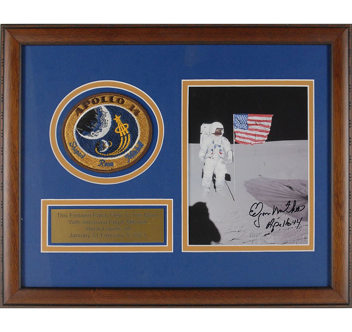 Flown embroidered Apollo 14 mission patch, 4? in diameter, carried into lunar orbit in the Apollo 14 Command Module Kitty Hawk; and a color 5.25 x 7 photo of Mitchell standing by the American flag on the lunar surface, signed in black felt tip, “Edgar Mitchell Apollo 14.” The patch and photo are double-matted and framed with an informational plaque to an overall size of 15.5 x 12.5. In fine condition. Accompanied by a 2000 letter of authenticity from Mitchell which reads, in part: “This is to certify that the accompanying four-inch diameter Apollo 14 cloth emblem patch was carried by me to the Moon aboard Apollo 14…It remained stowed aboard our Command Module ‘Kittyhawk’ during the entire duration of the mission…This mission patch has remained a treasured part of my personal space collection since February, 1971.”