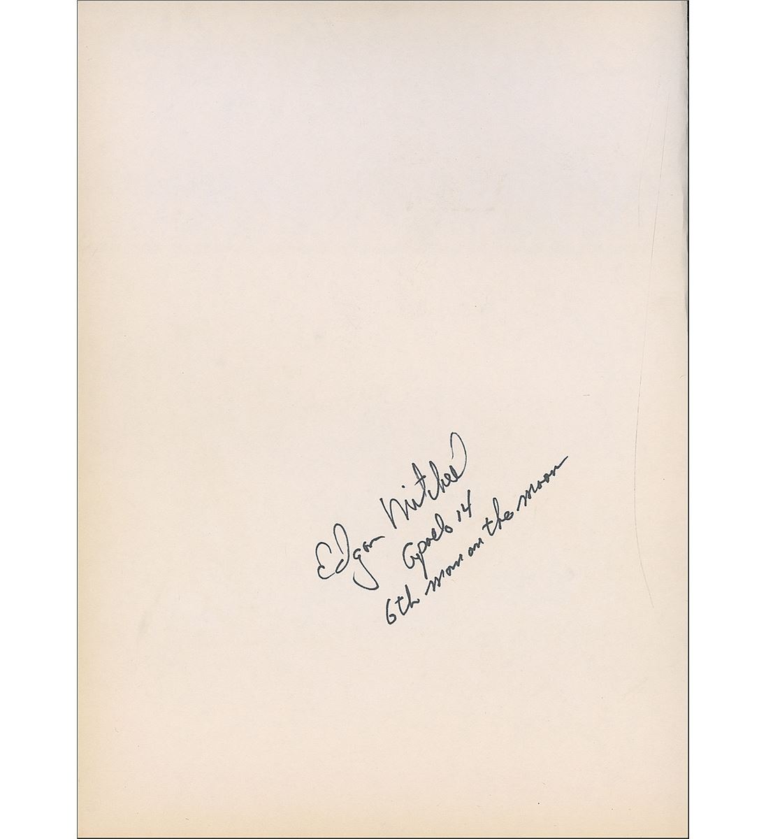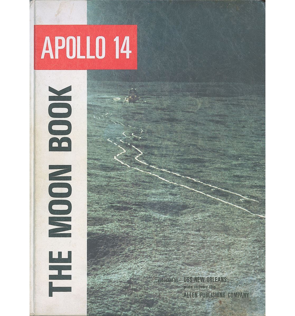Signed book: Apollo 14: The Moon Book. Allen Publishing, 1971. Hardcover, 9.25 x 12.25. Signed on the first free end page in black felt tip, “Edgar Mitchell, Apollo 14, 6th man on the moon” and in purple felt tip by Commanding Officer Captain Robert E. Moore of the recovery ship USS New Orleans on a page with his image. This rare book, compiled by the crew of the New Orleans, chronicles the events leading up to the splashdown and recovery of the command capsule, as well as the handling of the crew and capsule afterwards. In very good condition, with soiling and dings to the covers.