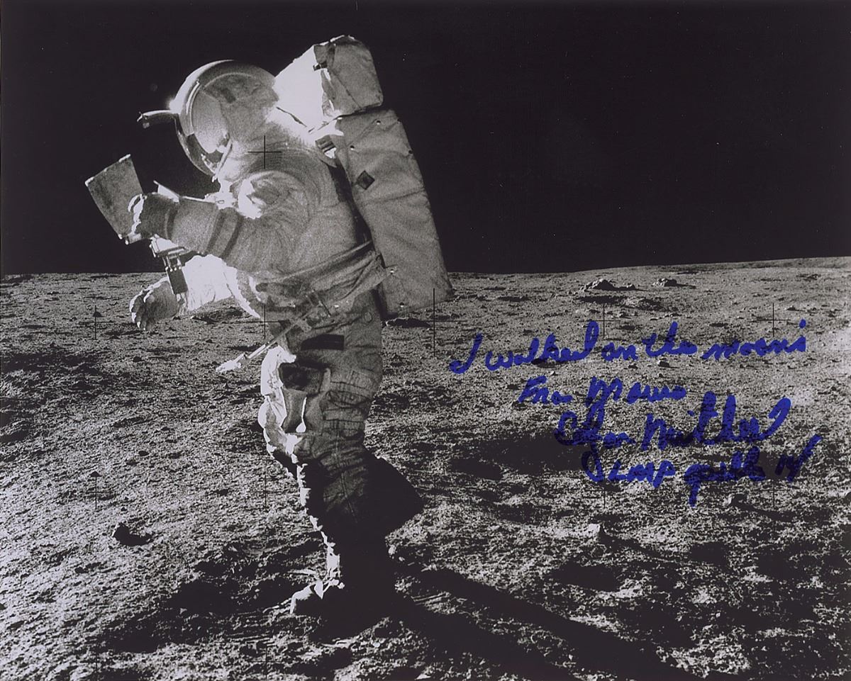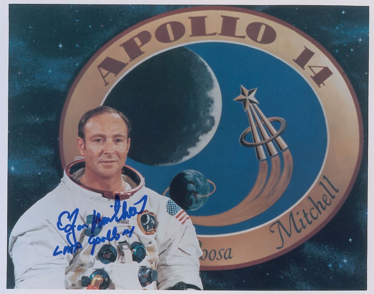 Two photos: a satin-finish 10 x 8 photo of Mitchell on the lunar surface, signed in blue felt tip, “I walked on the moon’s Fra Mauro, Edgar Mitchell, LMP Apollo 14”; and a color satin-finish 10 x 8 photo of Mitchell in his white spacesuit, signed in blue felt tip, “Edgar Mitchell, LMP Apollo 14.” In overall fine condition.