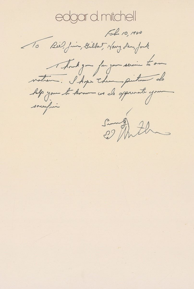 ALS signed “Ed Mitchell,” one page, 7 x 10.5, personal letterhead, February 10, 1980. Letter to Bill, Jim, Gilbert, Harry, Len, and Jack, in full: “Thank you for your service to our nation. I hope these pictures do help you to know we do appreciate your sacrifice.” In fine condition.