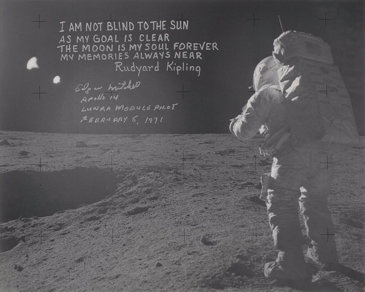 Semi–glossy 20 x 16 photo of a lone astronaut on the barren lunar surface, signed in silver ink, “Edgar Mitchell, Apollo 14, Lunar Module Pilot, February 5, 1971,” with another hand adding, “I am not blind to the sun, as my goal is clear, the moon is my soul forever, my memories always near, Rudyard Kipling.” In fine condition.