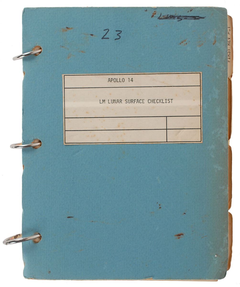 Ring-bound checklist used in training at the Kennedy Space Center simulators, entitled “Apollo 14, LM Lunar Surface Checklist,” approximately 150 pages, 6 x 8, signed inside the front cover in black ballpoint, “Edgar Mitchell, Apollo 14.” The checklist details the EVA procedures as well as instructions for an emergency launch. A few handwritten edits and corrections have been made throughout the checklist. In very good to fine condition, with scattered staining to covers from rusty binder rings (which appear to have been replaced) and some spots of foxing to tabs and first few pages. A training-used piece of the utmost desirability as it describes the key elements of the lunar surface operations.