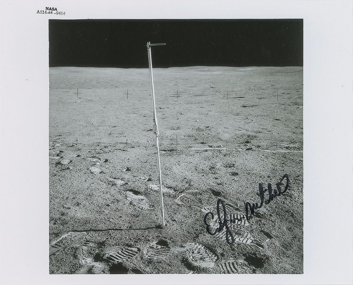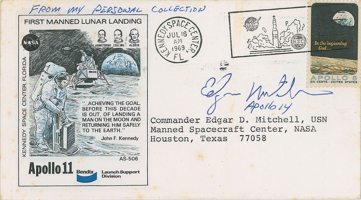Two items: an official semi-glossy 10 x 8 photo of a core tube stuck into the lunar terrain, signed in black felt tip, “Edgar Mitchell”; and an uncommon commemorative postal cover issued by Bendix Launch Support Division, with a cachet honoring the Apollo 11 mission, signed in blue ballpoint, “From my personal collection, Edgar Mitchell, Apollo 14.” In overall fine condition, with scattered toning to cover. Accompanied by a transmittal letter from Bendix.
