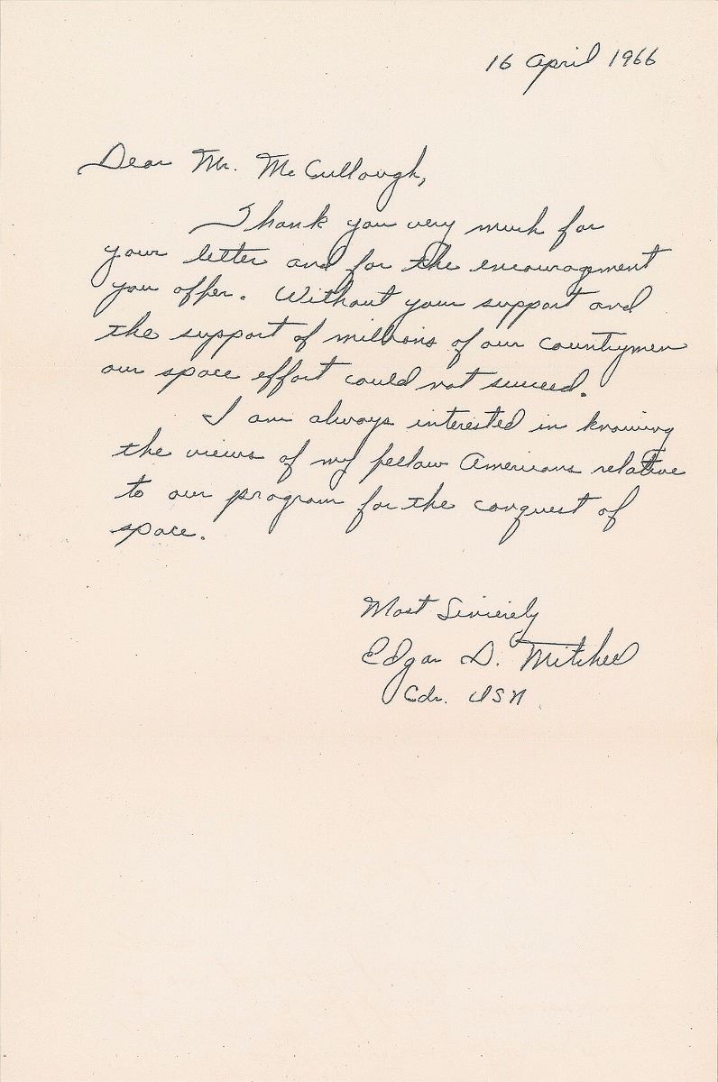 Early ALS signed “Edgar D. Mitchell, Cdr. USN,” one page, 6.25 x 9.5, April 16, 1966. Letter to George McCullough, in full: “Thank you very much for your letter and for the encouragement you offer. Without your support and the support of millions of our countrymen our space effort could not succeed. I am always interested in knowing the views of my fellow Americans relative to our program for the conquest of space.” In fine condition. Accompanied by the original mailing envelope, addressed in Mitchell’s own hand. Nearly five years after writing this letter, Mitchell became the sixth person to walk on the lunar surface.