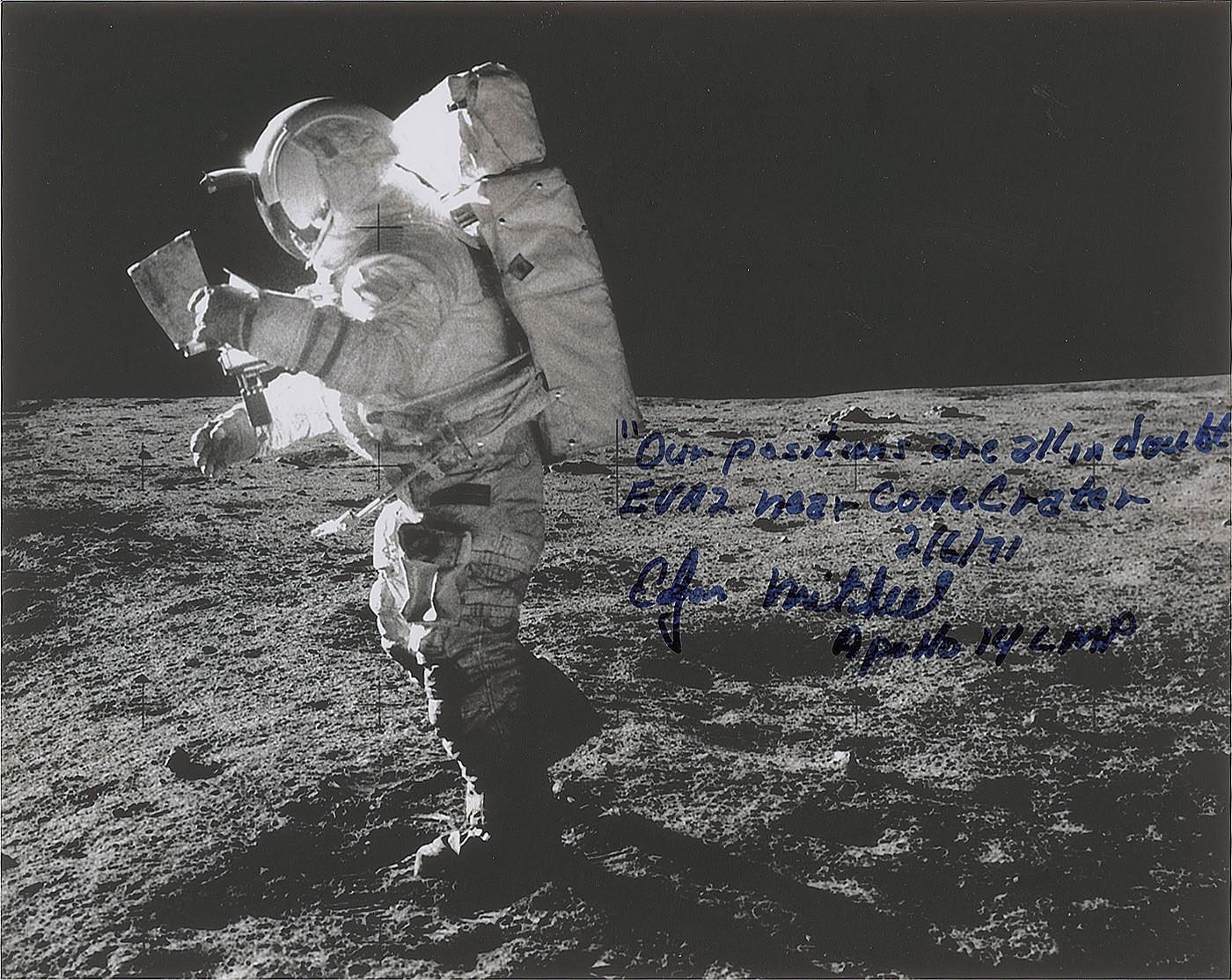 Attractive semi-glossy 10 x 8 full-length photo of LMP Mitchell walking along the lunar surface, signed in black felt tip, "'Our positions are all in doubt, EVA2 near cone crater, 2/6/71, Edgar Mitchell, Apollo 14 LMP." In very fine condition.