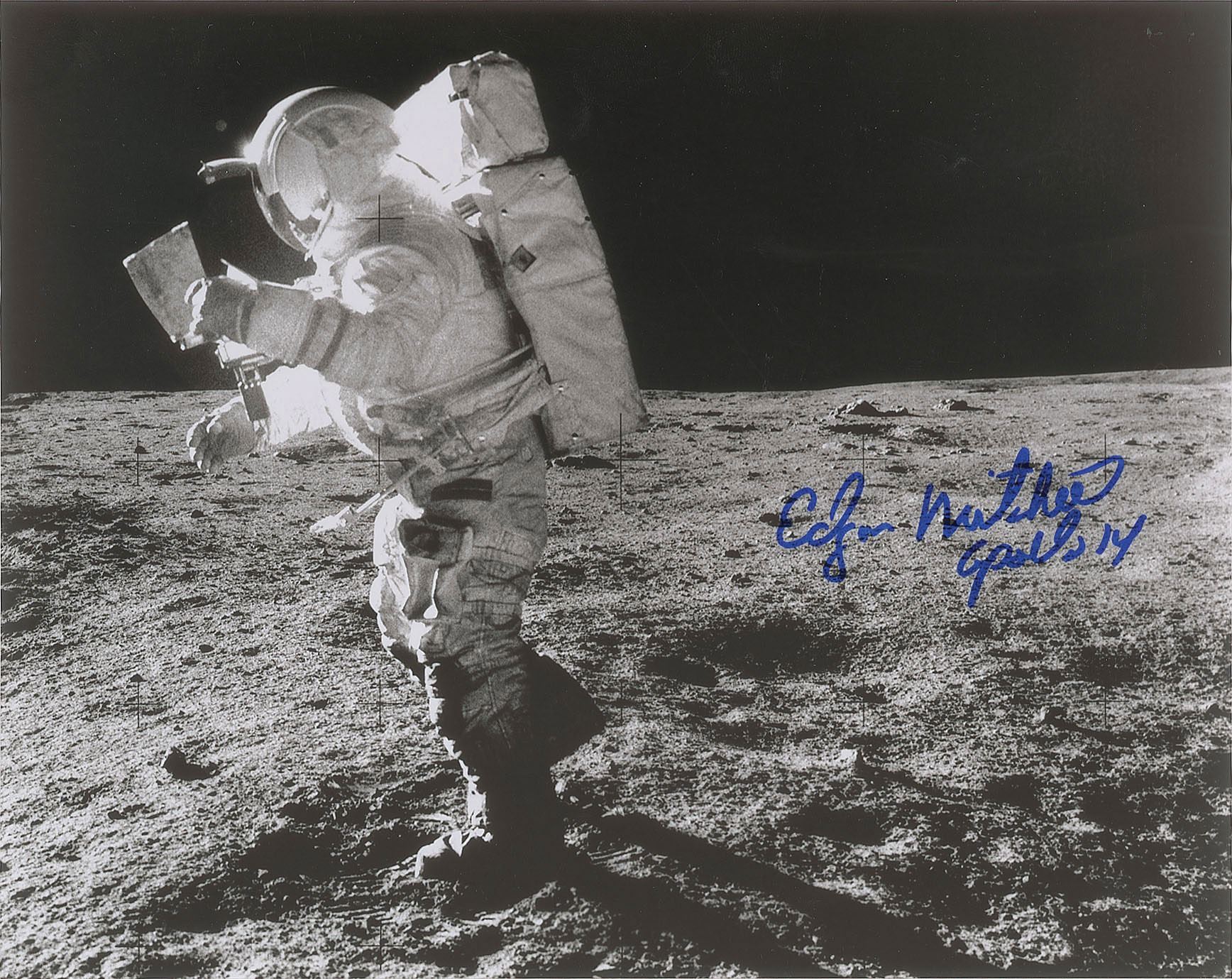 Semi-glossy 10 x 8 full-length photo of Mitchell walking on the lunar surface, signed in blue felt tip, "Edgar Mitchell, Apollo 14." In very fine condition.