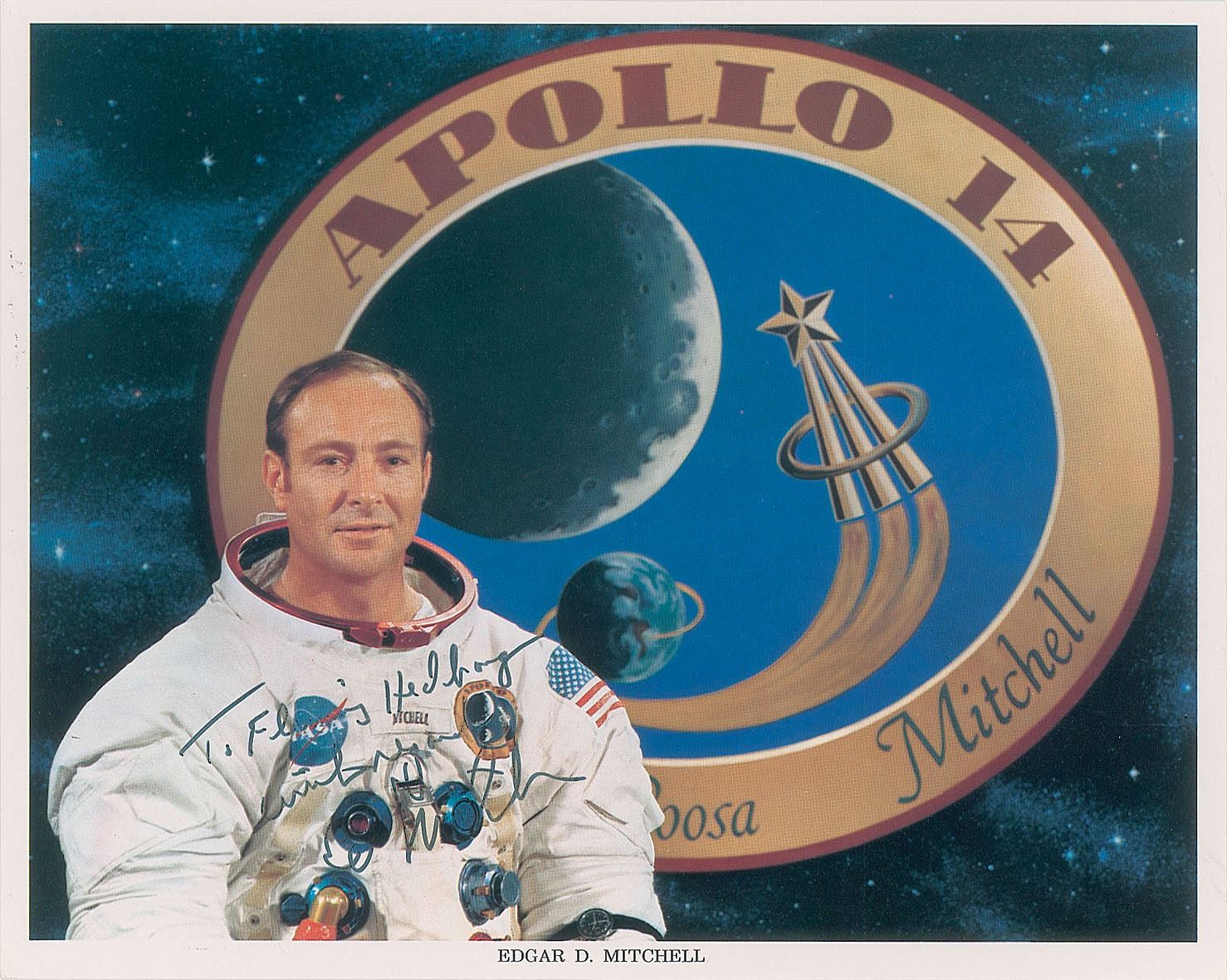 Official color 10 x 8 NASA lithograph of Mitchell posing in his white space suit against a backdrop featuring the Apollo 14 mission insignia, signed and inscribed in black felt tip, "To Flemming Hedborg, with regards, Ed Mitchell.” In fine condition.