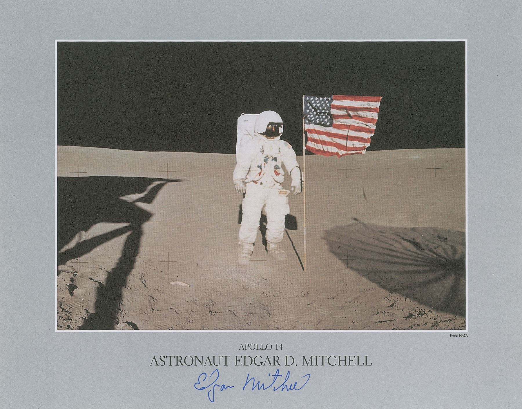 Attractive color 14 x 11 paperstock photo of Edgar Mitchell standing next to the American flag on the lunar surface during the Apollo 14 mission, signed in blue felt tip. In very fine condition.