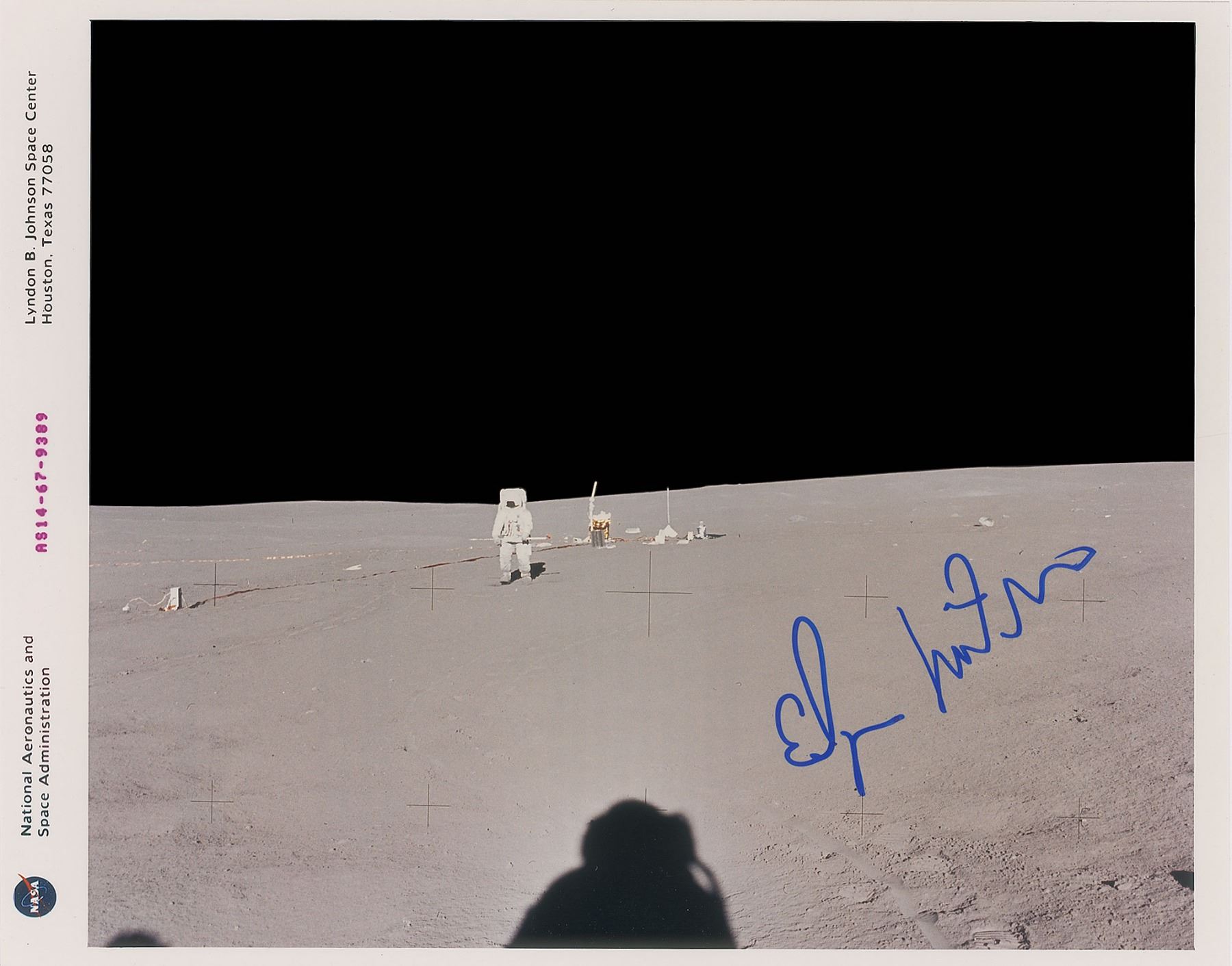 Official color satin-finish 10 x 8 red-numbered NASA photo of Mitchell deploying experiments on the lunar surface, signed in blue felt tip. Reverse bears black NASA caption text and "Kodak Professional" watermarks. In fine condition.