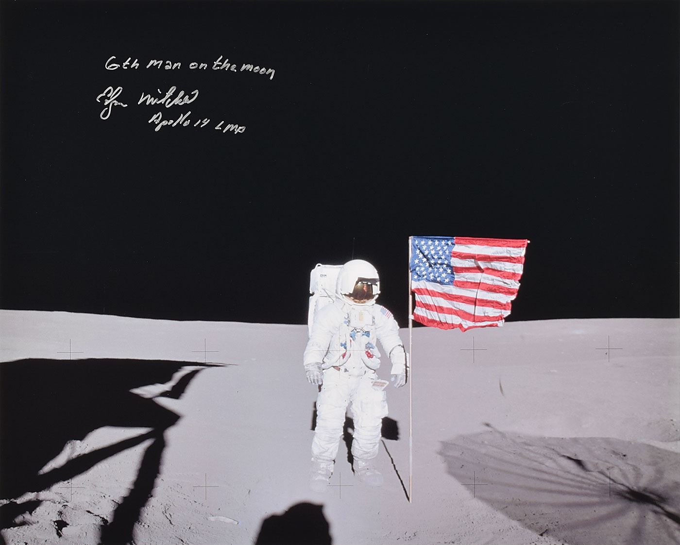 Color satin-finish 20 x 16 full-length photo of LMP Mitchell standing on the moon's surface next to the American flag during the third lunar-landing mission, signed in silver ink, "6th man on the moon, Edgar Mitchell, Apollo 14 LMP." In very fine condition.