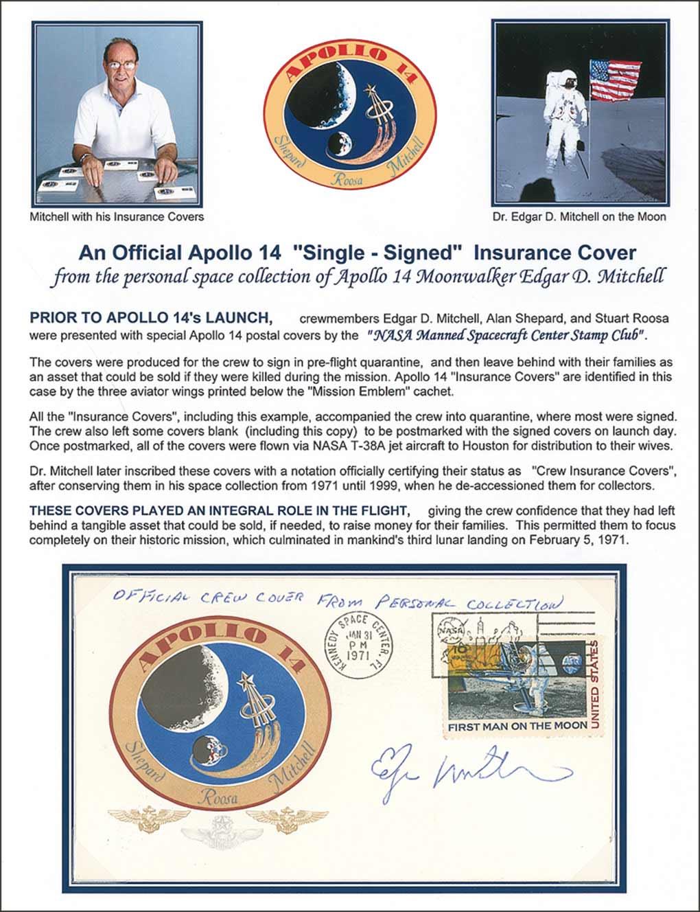 Apollo 14 insurance cover, 6.5 x 3.5, signed in ballpoint “Official crew cover from my personal collection, Edgar Mitchell.” The famous insurance covers, produced immediately prior to space missions in order to provide financial security for astronauts’ families in case of disaster, have earned near-legendary status as the ultimate space-related philatelic item and one of the most sought-after formats for astronaut autographs. A quantity of the Apollo 14 “insurance” covers, including the present example, were left unsigned by the crew during quarantine and were signed by Mitchell at a later date. Removably presented on a color 8.5 x 11 informational sheet. In very fine condition.