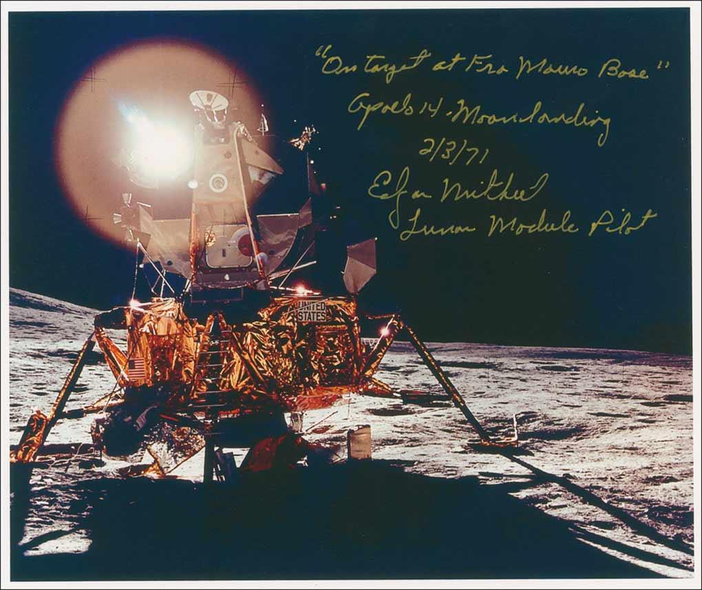 Color 9 x 7.75 laserprint photo of the Apollo 14 lunar lander on the surface of the moon, signed in gold ink, “On target at Fra Mauro Base’ Apollo 14 Moonlanding 2/3/71, Edgar Mithcell, Lunar Module Pilot.” In very fine condition.