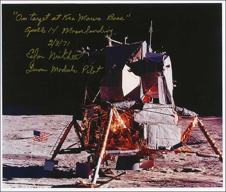 Color 9 x 7.75 laserprint photo of the Apollo 14 lunar lander on the surface of the moon, signed in gold ink, “’On target at Fra Mauro Base’ Apollo 14 Moonlanding 2/3/71, Edgar Mitchell, Lunar Module Pilot.” In fine condition. Pre-certified Scott Cornish and RRAuction COA.