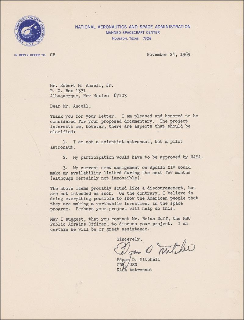 TLS signed “Edgar D. Mitchell,” one page, 8 x 10.5, NASA letterhead, November 24, 1969. Letter regarding a proposed documentary. In part: “I am pleased and honored to be considered for your proposed documentary. The project interests me, however, there are aspects that should be clarified: