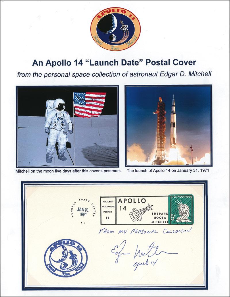 Apollo 14 launch date postal cover with a stamped cachet honoring Apollo 14, signed on the front in blue ballpoint, “From my personal collection, Edgar Mitchell, Apollo 14.” Removably presented on a color 8.5 x 11 informational sheet. In very fine condition. Pre-certified Scott Cornish and RRAuction COA.