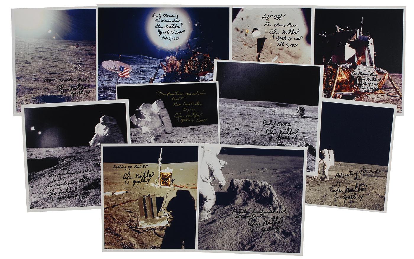 Ten color laser print photos of Mitchell on the lunar surface, ranging in size from 8.5 x 8.5 up to 10 x 8, each signed in ink or felt tip by Mitchell, adding short descriptions to each photo. In fine condition. Pre-certified Scott Cornish and RRAuction COA.