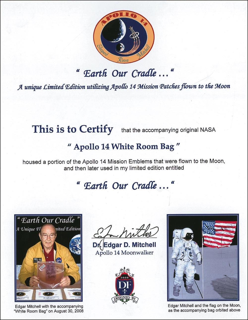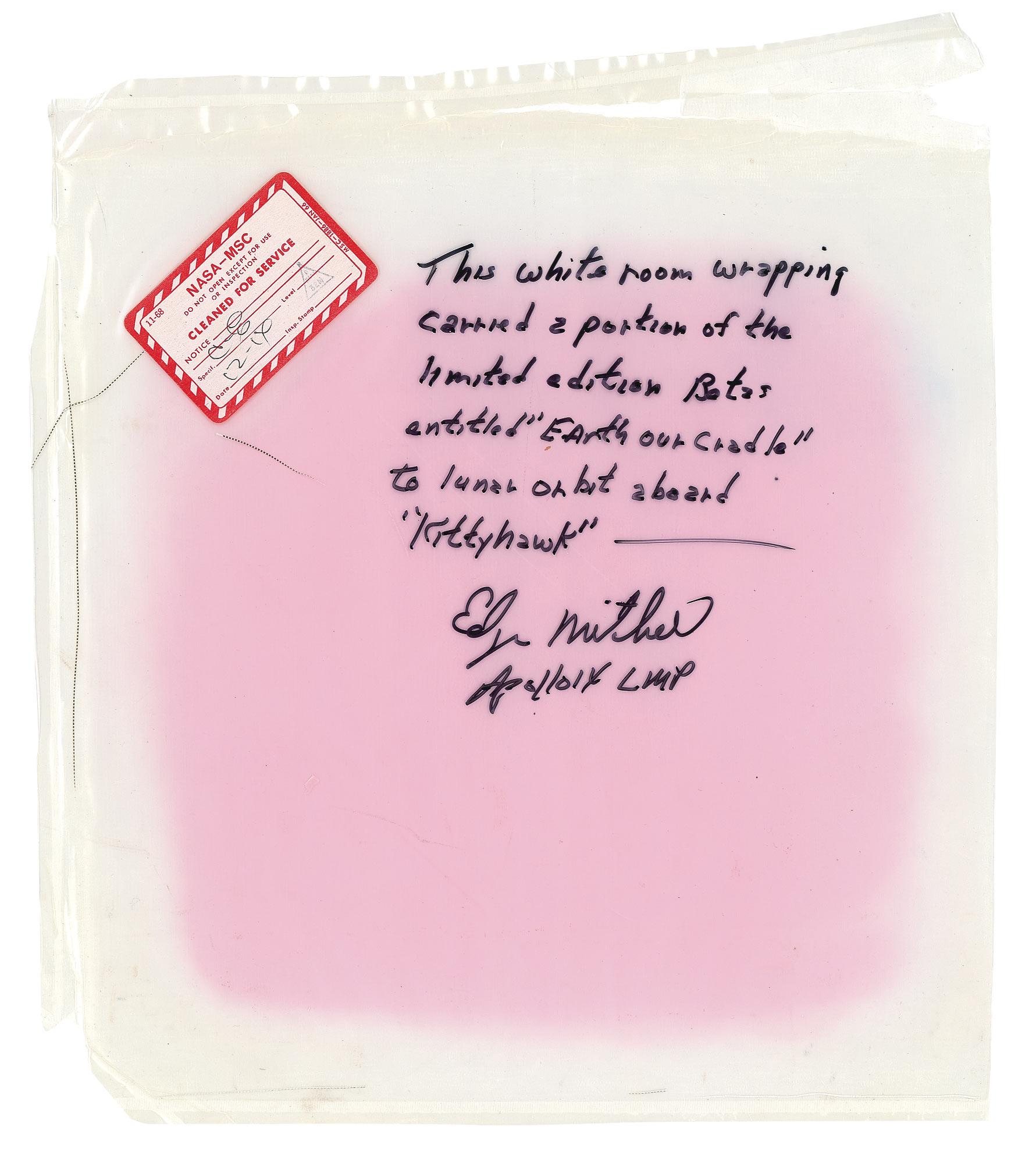 Apollo 14 flown “White Room” bag, 10 x 11, used to carry a portion of the Apollo 14 mission emblems to lunar orbit. These were the same emblems used in the limited edition “Earth Our Cradle.” The bag is signed in black felt tip, “This white room wrapping carried a portion of the limited edition Betas entitled ‘Earth Our Cradle’ to lunar orbit aboard ‘Kitty hawk.’ Edgar Mitchell, Apollo 14 LMP.” The bag also bears a NASA-MSC “cleaned for service” label. In fine condition, with a separation along the top edge, where the bag was originally opened. This well-preserved bag also retains some of its original pink coloration, and Edgar Mitchell’s handwritten inscription that contrasts nicely on surface of the bag. This is a unique opportunity for one purchaser of the“Earth Our Cradle” limited-edition to actually acquire one of the few original bags which carried the mission emblem used in the edition. Accompanied by a signed, illustrated letter of authenticity showing Mitchell with the bag and the emblems. Pre-certified Scott Cornish and RRAuction COA.