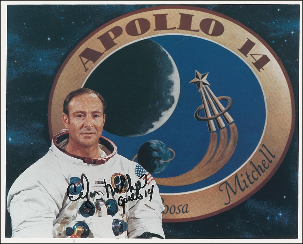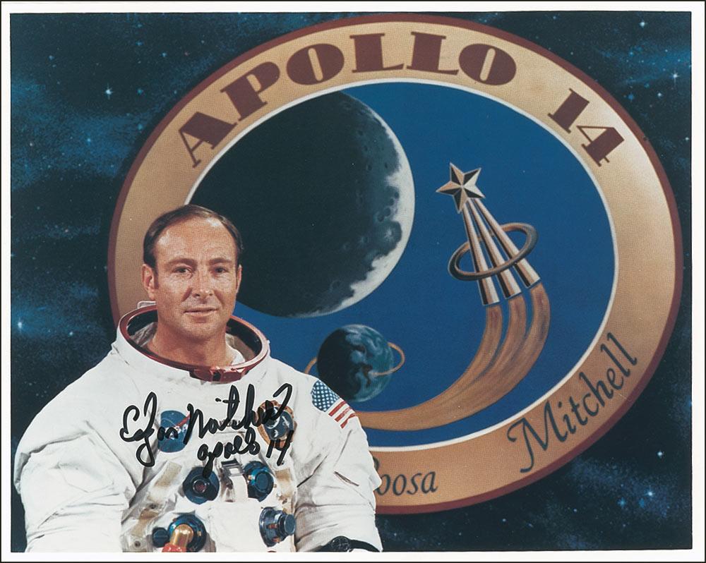 Two identical color satin-finish 10 x 8 photos of Mitchell in his space suit posing in front of the Apollo 14 mission emblem, each signed in black felt tip, “Edgar Mitchell, Apollo 14.” In very fine condition.