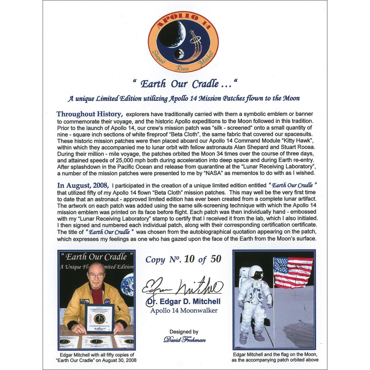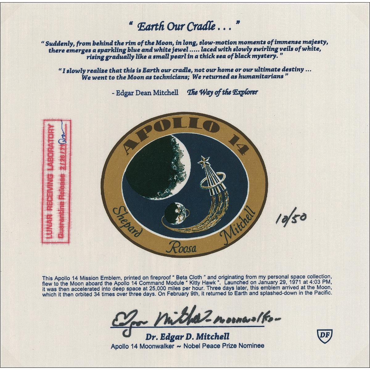 Copy number 10/50 beta cloth mission emblem, 9 x 8.75, from the unique Apollo 14 flown limited edition entitled “Earth Our Cradle.” Flown to lunar orbit aboard the Apollo 14 Command Module ‘Kittyhawk’ where it then orbited the moon 34 times before returning to earth. The center of the ‘beta cloth’ bears the Apollo 14 mission emblem which was silk-screened on before the flight, and the text for “Earth Our Cradle” which was silk-screened on after the flight to create the limited edition. Please review the accompanying certification signed by Edgar Mitchell for a complete description of this remarkable flown artifact. In fine condition. Professionally and removably shrink wrapped on acid free board.