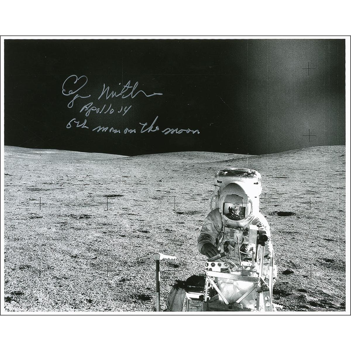 Satin-finish 10 x 8 photo of Mitchell on the lunar surface, signed in silver felt tip, “Edgar Mitchell, Apollo 14, 6th man on the moon.” In fine condition.