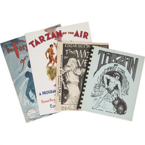 <B>Edgar Rice Burroughs</B></I>. <B>Four Related Publications</B></I>, including: <B><I>Tarzan of the Air</B></I></B></I><B> Radio Show Brochure in Original Envelope</B></I>. Tarzana, CA: Edgar Rice Burroughs, Inc. [1933]. Quarto. 4 pages. Glossy paper stock in 9 x12 inch envelope with ERB, Inc., return address. Overall very fine. [and:] <B>Edgar Rice Burroughs. </B></I><B><I>The Wizard of Venus</B></I></B></I><B> Souvenir of the 22nd World Science Fiction Convention</B></I>. [Tarzana, CA]: Edgar Rice Burroughs, Inc., 1964. Signed on the title page by contributor Dale Broadhurst and illustrator Mike Royer. Octavo. 36 pages. Stapled paper covers. Small tears on edges and one tiny stain at bottom right corner. Overall fine. [and:] <B>Michael Resnick. </B></I><B><I>The Forgotten Sea of Mars</B></I></B></I>. Tarzana, CA: Edgar Rice Burroughs, Inc., 1965. First edition. Included as a free supplement with <I>ERB-dom</B></I> magazine, January 1965. Quarto. 24 pages. Stapled paper booklet with illustrated cover. Overall fine. [and:] <B>Edward Hirschman. </B></I><B><I>Tarzan at Mars' Core</B></I></B></I>. Annandale, VA: The DeLethein Press, 1977. Octavo. 150 pages. Spiral-bound, illustrated paper covers. Overall fine. <I>From the Robert and Diane Yaspan Collection.</B></I><BR><BR><b>Shipping:</b> Books & Catalogs (<a target="_blank" href="http://www.heritageauctions.com/common/shipping.php">view shipping information</a>)