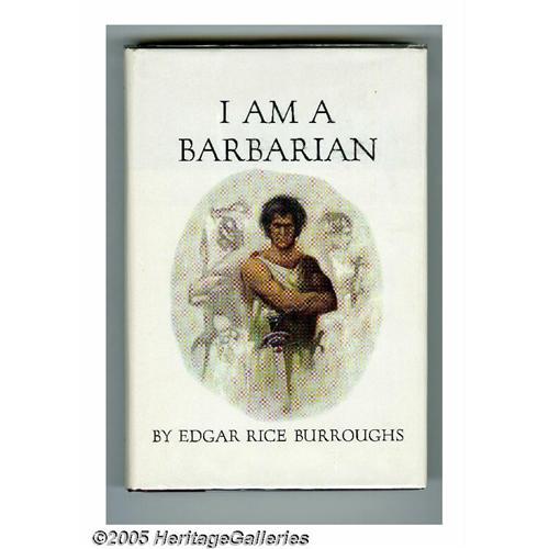 <B>Edgar Rice Burroughs - ""I Am A Barbarian,"" First Edition (Burroughs, 1967).</B></I> The cover and frontispiece of this book both feature illustrations by Jeff Jones. This historical novel, set in ancient Rome, was one of Edgar Rice Burroughs' few stand-alone titles. The dust jacket blurb for the book notes, ""Edgar Rice Burroughs wrote " "<B>I Am A Barbarian</B></I> while living in Honolulu. The story was completed only a few short months before Pearl Harbor. Burroughs was an eye-witness to the attack, and in the years that followed, the manuscript was all but forgotten."" This copy is an Excellent condition book in an Excellent condition dust jacket. <BR><BR><B>Important notice:</B> Heritage usually auctions material at the rate of 200-250 lots per hour. On some occasions eBay Live bid software or the Internet may not be able to keep up with the pace of the auction. We recommend placing a realistic absentee bid now as insurance to avoid disappointment. Occasionally the auctioneer may eliminate or reject an eBay Live bid, and the auctioneer may also reopen a lot after the close of the eBay live bidding (usually because we missed an audience bid), and may reject your bid even if it shows you as the winning bidder. By bidding via eBay Live, you agree that Heritage may award the lot to another bidder at its sole discretion under the circumstances described above or any other reasonable circumstances. Since eBay bids are not shown to us until we open the lot on the floor, we treat those bids just like floor bids. In most cases the floor responds before the eBay bid is presented to us, due to Internet lag time, so for consistency we have made it a policy that floor bids are always considered first over tie eBay live bids. Also please note that all Heritage lots purchased through eBay Live carry a 20% Buyer's Premium. Please make sure you read the Terms and Conditions before you bid. This lot is being auctioned in conjunction with a live floor auction by Heritage Ga