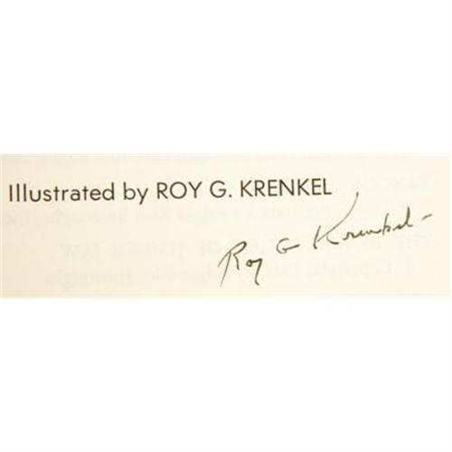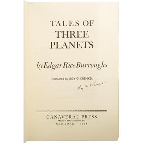 <B>Edgar Rice Burroughs: </B></I><B><I>Tales of Three Planets</B></I></B></I>. (New York: Canaveral Press, 1964), first edition, 282 pages, signed by the illustrator, Roy G. Krenkel on the title page, blue cloth with black titles, dust jacket (unclipped), 8vo (5.75” x 8.25”), light shelf wear with slightly bumped corners, else a very good copy in a slightly toned but very good jacket.<BR><BR><b>Shipping:</b> Books & Catalogs (<a target="_blank" href="http://www.heritageauctions.com/common/shipping.php">view shipping information</a>)