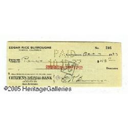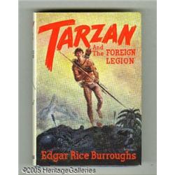<B>Edgar Rice Burroughs - Tarzan and the Foreign Legion Book and Signed Check (Edgar Rice Burroughs Inc., 1947).</B></I> With this lot, one determined bidder will receive a signed check written by Edgar Rice Burroughs to "Pene's" for the amount of $43.11 on Oct. 7th, 1937 -- and that's in addition to a rare and wonderful book. This copy of <B>Tarzan and the Foreign Legion</B></I> is an Edgar Rice Burroughs Inc. first edition, and contains an interesting note that reads in part, "This book is one of the few survivors of a near-disastrous fire that occurred in our storeroom on Saturday, May 3, 1958... Although this book shows fire damage, we are told it has considerable value among collectors." The fire damage mentioned in the note is limited to some faint smoke marks on the top edge; with the exception of these smoke marks this book grades as a solid Fine -- and the signed check is in excellent condition too!