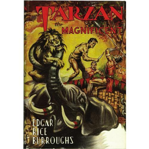 <B>Edgar Rice Burroughs - Tarzan the Magnificent First Edition (Edgar Rice Burroughs Inc., 1939).</B></I> This copy of <B>Tarzan the Magnificent</B></I> is the first edition, printed by Burroughs' own publishing house, Edgar Rice Burroughs Inc. Accompanying this book is a small card that notes, "This book is one of the few survivors of a near-disastrous fire that occurred in our storeroom on Saturday, May 3, 1958. The fire started as a result of the spontaneous combustion of old Tarzan motion pictures printed on nitrate film. Although this book shows fire damage, we are told it has considerable value among collectors..." The fire damage mentioned in the note is limited to unobtrusive smoke marks along the top of the book, and near the upper part of the open edge. Other than these very minor smoke marks, this book and dust jacket both grade Fine. <BR><BR><B>Important notice:</B> Heritage usually auctions material at the rate of 200-250 lots per hour. On some occasions eBay Live bid software or the Internet may not be able to keep up with the pace of the auction. We recommend placing a realistic absentee bid now as insurance to avoid disappointment. Occasionally the auctioneer may eliminate or reject an eBay Live bid, and the auctioneer may also reopen a lot after the close of the eBay live bidding (usually because we missed an audience bid), and may reject your bid even if it shows you as the winning bidder. By bidding via eBay Live, you agree that Heritage may award the lot to another bidder at its sole discretion under the circumstances described above or any other reasonable circumstances. Since eBay bids are not shown to us until we open the lot on the floor, we treat those bids just like floor bids. In most cases the floor responds before the eBay bid is presented to us, due to Internet lag time, so for consistency we have made it a policy that floor bids are always considered first over tie eBay live bids. Also please note that all Heritage lots purchased through eBay Live carry a 22.5% Buyer's Premium. Please make sure you read the Terms and Conditions before you bid. This lot is being auctioned in conjunction with a live floor auction by Heritage Auction Galleries. All final auction and invoice information will be supplied by Heritage Auction Galleries, and all other information should be considered preliminary. Lot:41001 <BR><BR><B>Winning Notification and Billing:</B> After the FINAL session in this auction is complete, Heritage will send e-mail and snail mail invoices. This process normally takes several days. All final auction and invoice information will be supplied by Heritage Auction Galleries, and all other information should be considered preliminary. <BR><BR>This auction will be conducted on a live auction floor and over the Internet through eBay Live. If you choose to place an absentee bid, please take a moment to <font color='#0000ff'><u><a href='http://pages.ebay.com/liveauctions/help/before/laabsentee.html'>learn how eBay Live absentee bidding works</a></u></font><font color='#000000'>