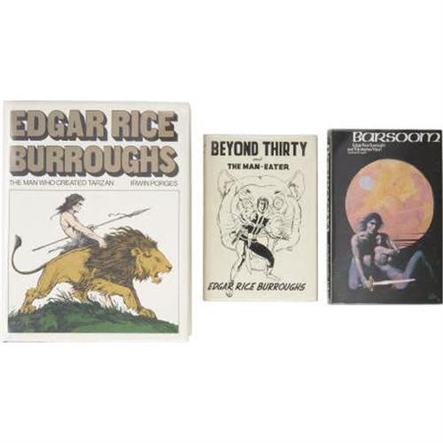 <B>Edgar Rice Burroughs</B></I>. <B>Three First Editions</B></I>, including: <B>Edgar Rice Burroughs. </B></I><B><I>Beyond Thirty and the Man-Eater</B></I></B></I>. New York: Science Fiction and Fantasy Publications, 1957. Limited edition of 3,000 copies. Octavo. 229 pages. Red cloth with gold spine titles. Fine. [and<B>:] Irwin Porges. </B></I><B><I>Edgar Rice Burroughs: The Man Who Created Tarzan</B></I></B></I>. Provo, Utah: Brigham Young University Press, 1975. Quarto. 817 pages. Notes. Index. Quarter-bound with black-leather spine and yellow cloth on boards. Gold spine titles and decorations, and Burroughs facsimile signature on front cover. Overall, book and dust jacket are fine. [and:] Richard A. Lupoff. <B><I>Barsoom: Edgar Rice Burroughs and The Martian Vision</B></I></B></I>. Baltimore: The Mirage Press, 1976. Octavo. 155 pages. Black cloth with gold spine titles. Overall, fine. <I>From the Robert and Diane Yaspan Collection.</B></I><BR><BR><b>Shipping:</b> Books & Catalogs (<a target="_blank" href="http://www.heritageauctions.com/common/shipping.php">view shipping information</a>)