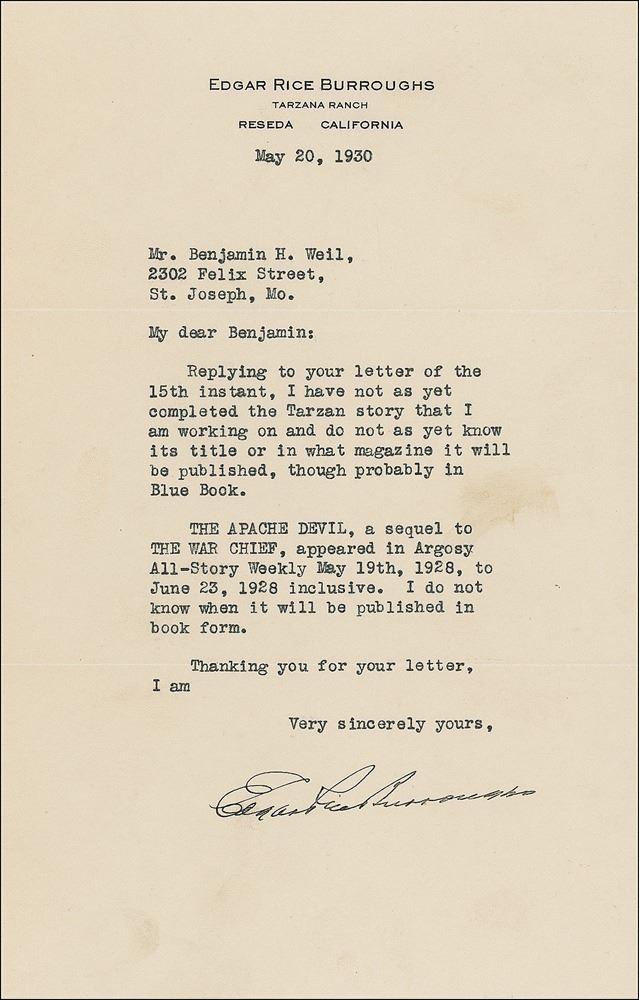TLS, one page, 5.5 x 8.5, personal letterhead, May 20, 1930. Burroughs writes a letter to Benjamin Weil, in part: "I have not as yet completed the Tarzan story that I am working on and do not as yet know its title or in what magazine it will be published, though probably in Blue Book. THE APACHE DEVIL, a sequel to THE WAR CHIEF, appeared in Argosy All-Story Weekly May 19th, 1928, to June 23, 1928 inclusive. I do not know when it will be published in book form." In fine condition. Accompanied by the original mailing envelope.