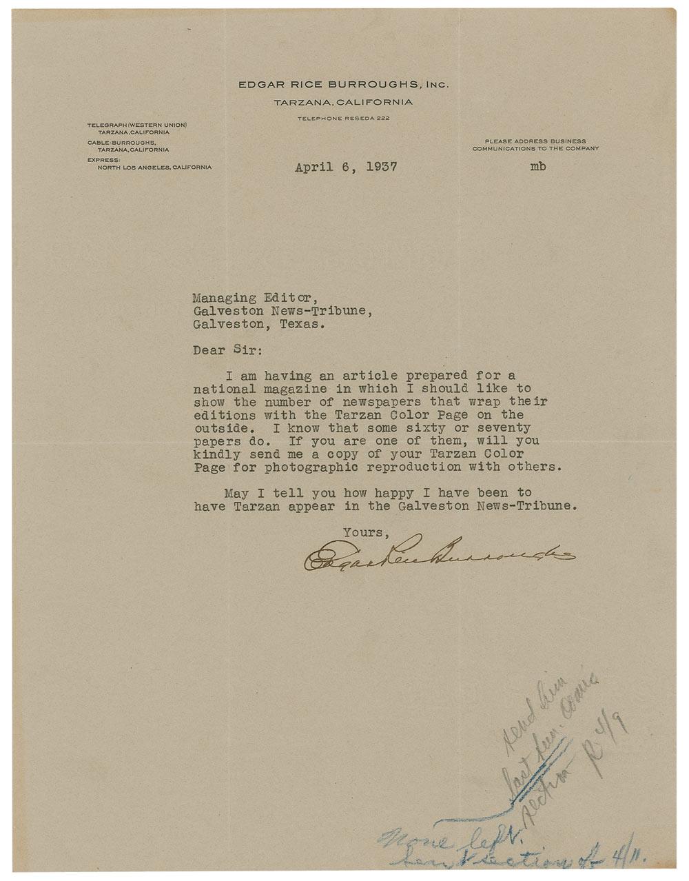 American novelist (1875–1950) best known for his popular series of novels based on feral-child-turned-jungle hero Tarzan. TLS, one page, 8.5 x 11, Edgar Rice Burroughs, Inc. letterhead, April 6, 1937. Letter to the Managing Editor of the Galveston News-Tribune. In full: “I am having an article prepared for a national magazine in which I should like to show the number of newspapers that wrap their editions with the Tarzan Color Page on the outside. I know that some sixty or seventy papers do. If you are one of them, will you kindly send me a copy of your Tarzan Color Page for photographic reproduction with others. May I tell you how happy I have been to have Tarzan appear in the Galveston News-Tribune.” In fine condition, with intersecting folds, one through a single letter of signature, several pencil notations to bottom right corner, and some mild toning and wrinkling. Newspapers would often entice people to buy their publication by showing the colorful and popular comic strips on the outside of the latest edition, and Tarzan was one of the most popular strips of its day. Great direct reference to his memorable character.