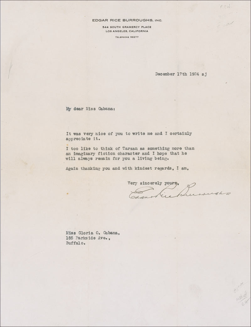 TLS, one page, 8.5 x 11, Edgar Rice Burroughs Inc. letterhead, December 17, 1924. Letter to an admirer. In part: “I too like to think of Tarzan as something more than an imaginary fiction character and I hope that he will always remain for you a living being.” In fine condition, with intersecting folds, one through a single letter of signature, a few small pencil notations, and some mild toning. Accompanied by the original mailing envelope.