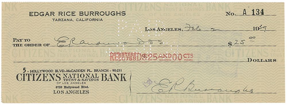 Personal check, 8.5 x 3, filled out and signed by Burroughs, “E. R. Burroughs,” payable to E. R. Andrews. DDS for $25.00, February 2, 1939. In fine condition, with a central vertical fold passing through first initial of signature, small stamp next to signature, and cancellation holes to top.