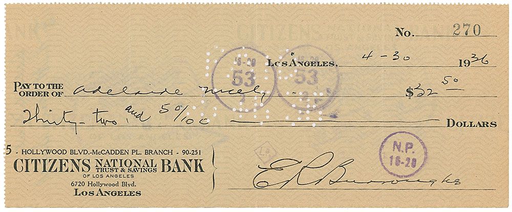 Bank check, 7.75 x 3, filled out and signed by Burroughs, “E. R. Burroughs,” payable to Adelaide Nicely for $32.50, April 30, 1936. Three vertical folds, one through a single letter of signature, and expected cancellation holes and stamps, otherwise fine condition. Accompanied by an unsigned glossy 8 x 10 photo.