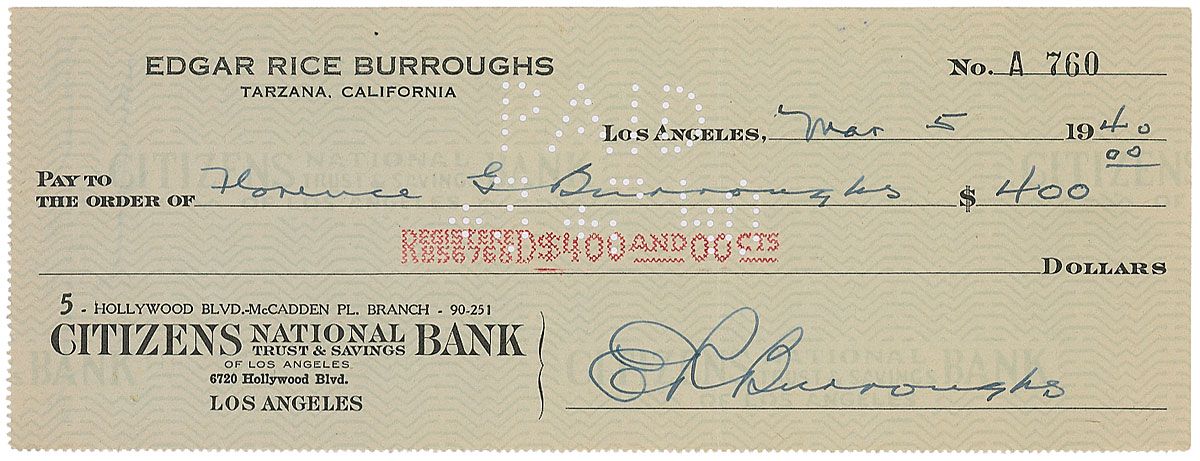 Personal check, 8.25 x 3, filled out in another hand and signed by Burroughs, “E. R. Burroughs,” payable to Florence G. Burroughs for $400.00, March 5, 1940. In fine condition, with a vertical fold through second initial and cancellation holes to upper portion.