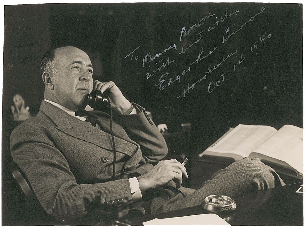 Vintage 8 x 6 photo of Burroughs on the telephone, signed and inscribed in white ink, “To Kenny Browne, with best wishes, Edgar Rice Burroughs, Honolulu, Oct. 14, 1940.” In fine condition, with trimmed edges.