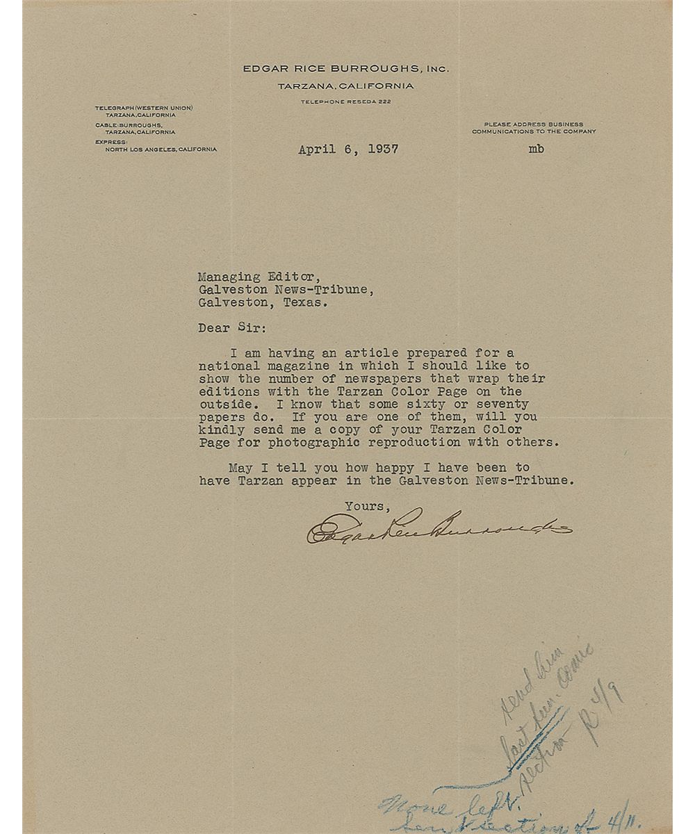 TLS, one page, 8.5 x 11, Edgar Rice Burroughs, Inc. letterhead, April 6, 1937. Letter to the managing editor of the Galveston News-Tribune. In full: “I am having an article prepared for a national magazine in which I should like to show the number of newspapers that wrap their editions with the Tarzan Color Page on the outside. I know that some sixty or seventy papers do. If you are one of them, will you kindly send me a copy of your Tarzan Color Page for photographic reproduction with others. May I tell you how happy I have been to have Tarzan appear in the Galveston News-Tribune.” Intersecting folds, one through a single letter of signature, and several pencil notations to bottom, otherwise fine condition.